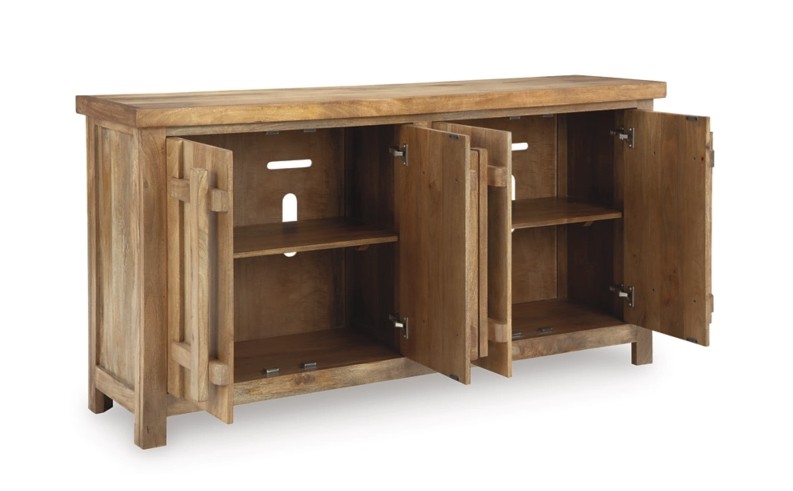Say hello to style and bid farewell to clutter without compromising on design. This accent cabinet radiates refined modern craftsman influence. Impressive detailing and cabinets with dynamic oversized wooden pulls create organic appeal. Offering ample storage space for your essentials, don't just organize your home—artfully arrange it.